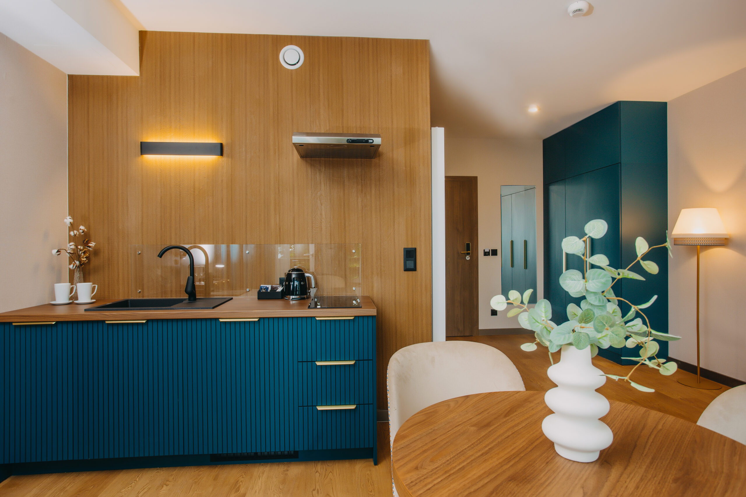 - komfortowe apartamenty – każdy z nich wyposażony w aneks kuchenny, a część z nich posiada prywatne sauny;